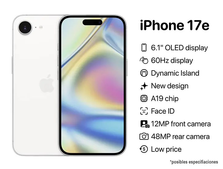Apple estaría preparando un nuevo integrante para su catálogo con el iPhone 17e, un modelo que, según las últimas filtraciones, buscaría un equilibrio entre rendimiento, diseño y precio, sin llegar al nivel de los modelos Pro. Su presentación estaría prevista para el 19 de febrero (fecha estimada).