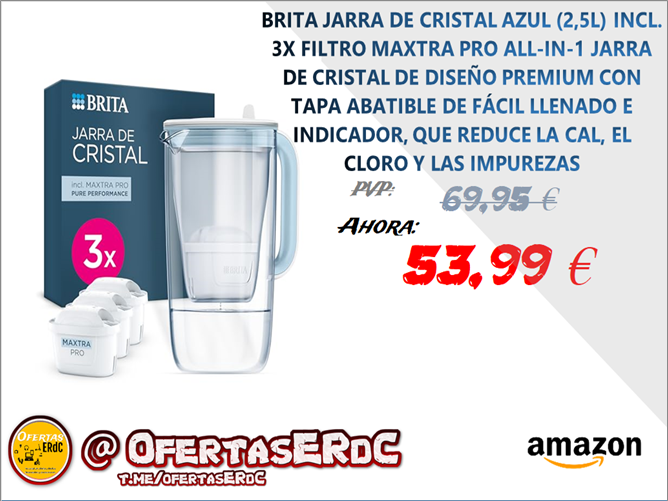 Incluye: 1x jarra de cristal BRITA (2,5 L) en color azul, 3x cartucho de filtro MAXTRA PRO ALL-IN-1.