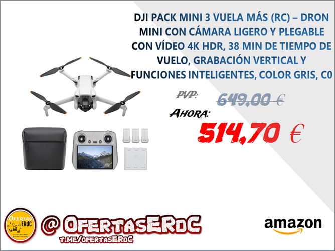 HASTA 114 min de tiempo de vuelo con 3 baterías – El pack Vuela Más incluye dos baterías adicionales (tres en total) para un tiempo de vuelo total de hasta 114 minutos, [2] Mini 3 ofrece tiempo de sobra para componer la toma perfecta.