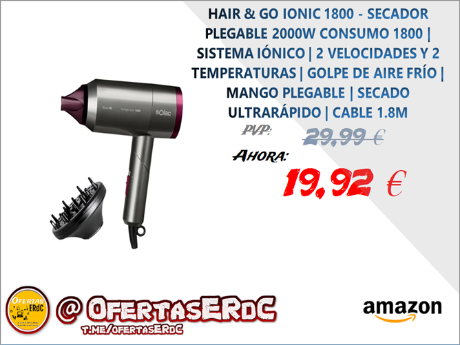 🌪️【SECADO ULTRARRÁPIDO】Con un flujo de aire caliente de más de 90 km/h, el secador Hair & Go Ionic 1800 garantiza un secado veloz y eficaz, ideal para ahorrar tiempo mientras consigues un cabello perfectamente seco y con volumen. ¡Seca tu melena en un abrir y cerrar de ojos!