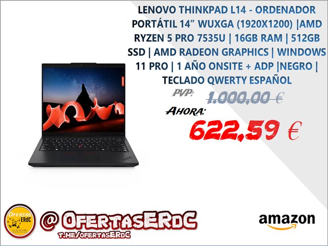 Lenovo Thinkpad L14 – Ordenador Portátil 14” WUXGA (1920×1200) | AMD Ryzen 5 PRO 7535U | 16GB RAM | 512GB SSD | AMD Radeon Graphics | Windows 11 PRO | 1 AÑO ONSITE + ADP | Negro | Teclado QWERTY Español
