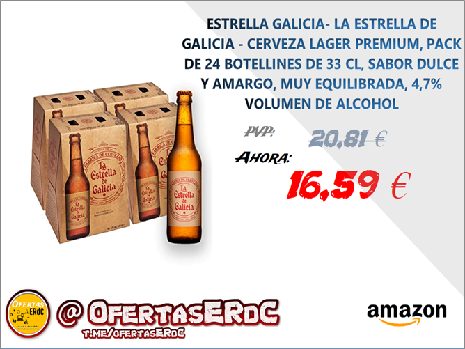 CERVEZA LA ESTRELLA DE GALICIA. Pack de cervezas lager con un sabor dulce y amargo por igual. Es maltosa, ligeramente lupulada y floral, con sutiles notas frescas y un agradable postgusto dulce. Se recomienda su consumo entre 4 y 5º