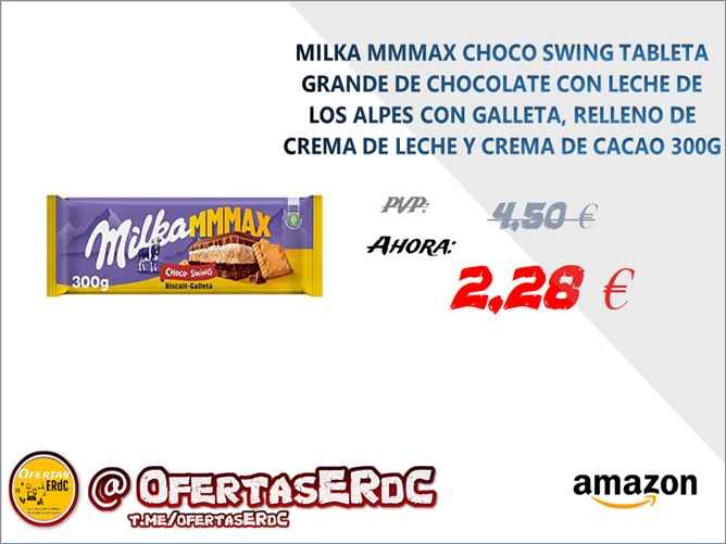 La tableta de chocolate con leche gigante triple capa Milka MMMAX Choco Swing acompañada de una deliciosa galleta, una capa de crema de cacao y una capa de crema de leche, crean la perfecta combinación para servir como un irresistible tentempié, para picar como snack o para disfrutar de un dulce descanso.