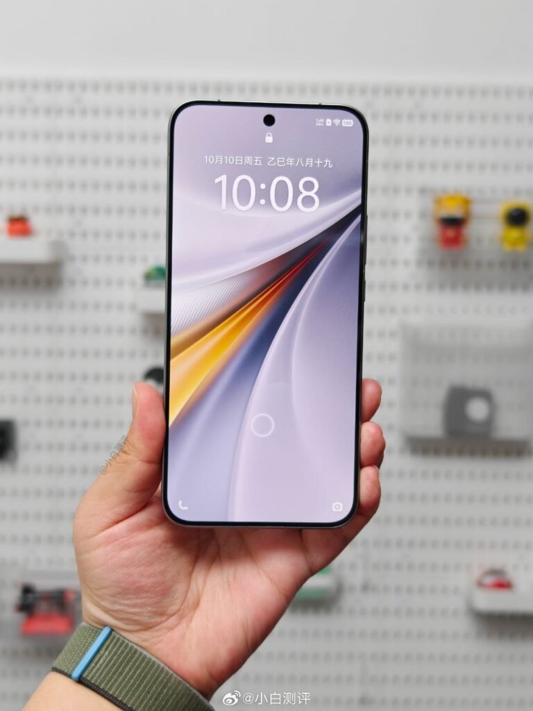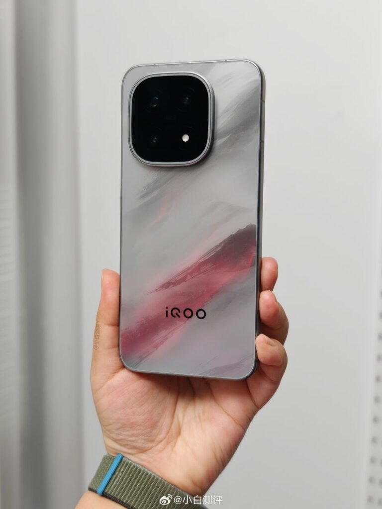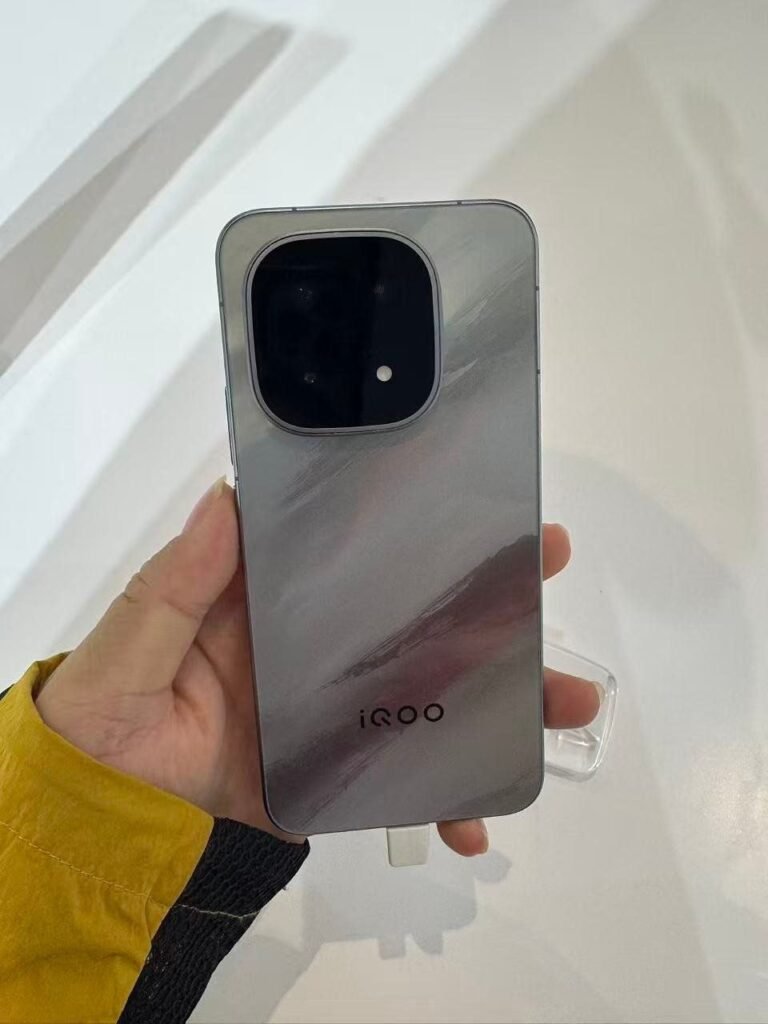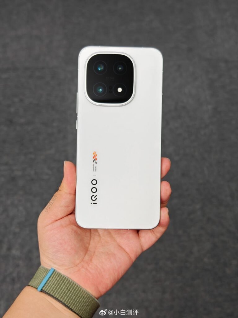 Las primeras imágenes reales del dispositivo confirman un diseño trasero en color blanco mate, con el característico logo de iQOO acompañado de la franja de colores inspirada en el automovilismo.