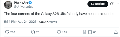 Desde el lanzamiento del Galaxy S22 Ultra, Samsung decidió imponer un lenguaje de diseño basado en líneas rectas y esquinas marcadas, acompañadas por la ranura del S Pen. Este estilo se mantuvo casi intacto en los S23 y S24 Ultra, mientras que el actual S25 Ultra solo suavizó ligeramente los bordes. Ahora, de acuerdo con el filtrador Phoneart (@UniverseIce), el S26 Ultra daría un paso más allá, con esquinas más redondeadas que las de cualquier predecesor. Este cambio podría hacer que el terminal en cuestión se ajuste mejor a la palma de la mano, reduzca la sensación de volumen y se acomode con mayor facilidad en los bolsillos, un detalle pequeño pero que marca la diferencia en la experiencia diaria.