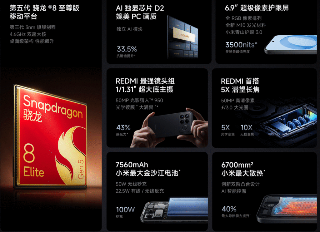 El Redmi K90 Pro Max incorpora el nuevo Snapdragon 8 Elite Gen 5, el chip más potente de Qualcomm, acompañado de memoria LPDDR5X y almacenamiento UFS 4.1, lo que garantiza velocidades de lectura y escritura ultrarrápidas.